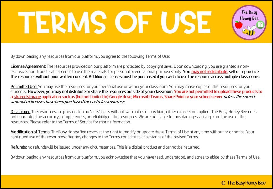 • This product is protected by Copyright Laws. The design, concept, and layout of this product is strictly the intellectual property of The Busy Honey Bee. This is for personal or single-classroom use only. By purchasing or downloading this resource, you agree to the following terms:
