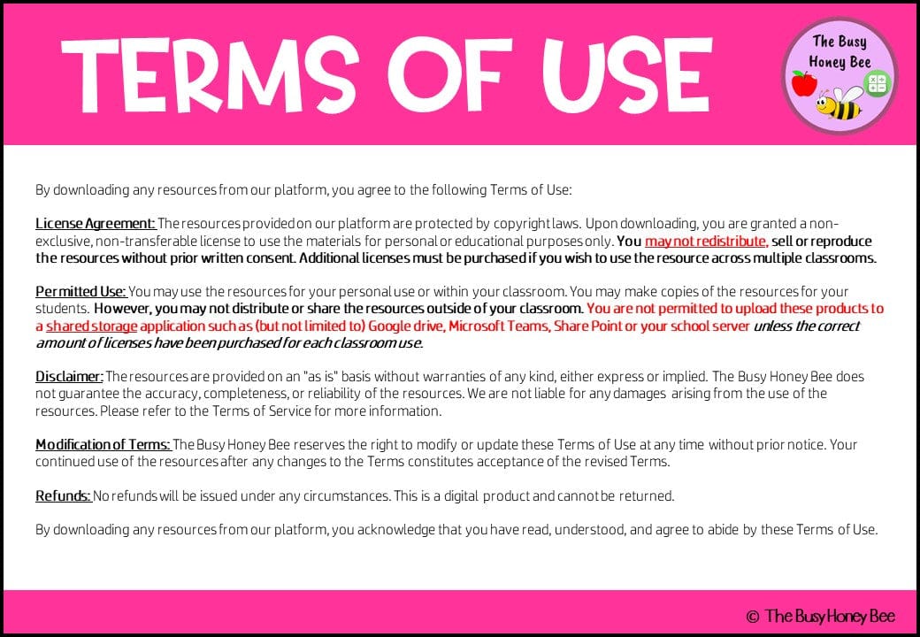 • This product is protected by Copyright Laws. The design, concept, and layout of this product is strictly the intellectual property of The Busy Honey Bee. This is for personal or single-classroom use only. By purchasing or downloading this resource, you agree to the following terms: