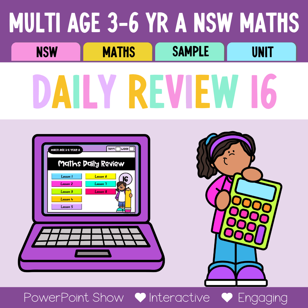 This Maths Daily Review has been designed to directly complement the learning concepts explored throughout the NSW Multi Age 3-6 Year A Maths Sample Unit of Work Unit 16.