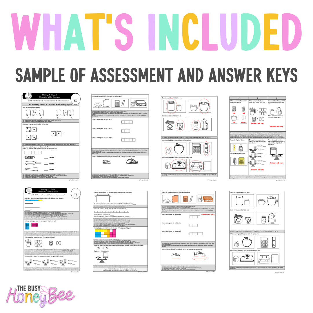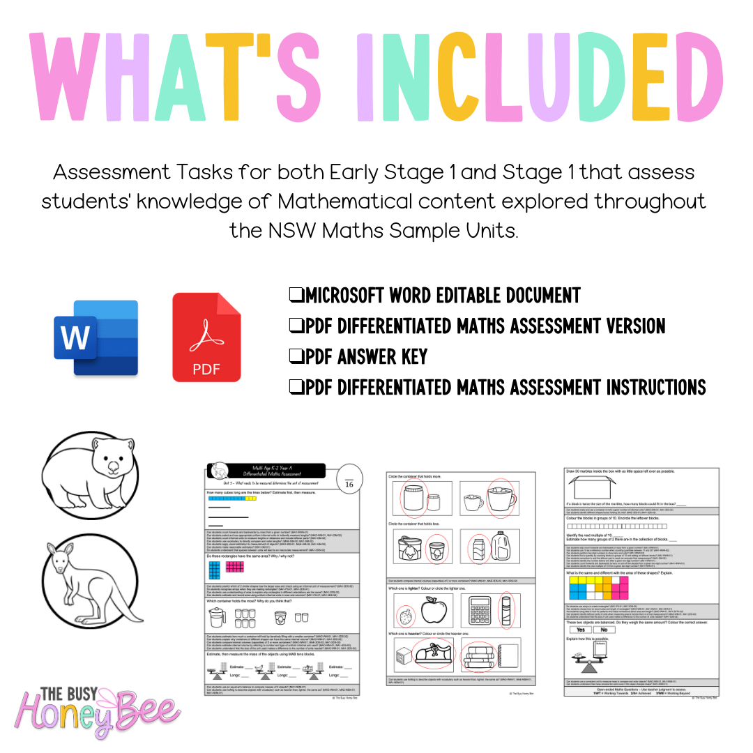 This Differentiated Maths Assessment is designed to align seamlessly with the NSW Maths Sample Units of Work for Multi-Age K-2 Year A, assessing both Early Stage 1 and Stage 1 outcomes. Carefully crafted to support diverse learners, this resource ensures that all students feel capable and engaged while demonstrating their understanding of key mathematical concepts.