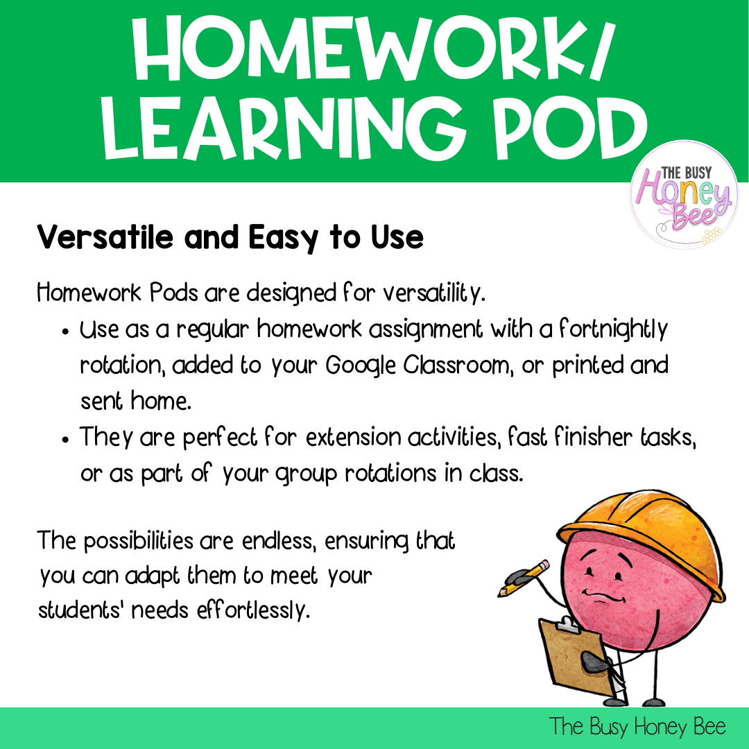 Homework/Learning Pods are designed for versatility. They can be used as a regular homework assignment with a fortnightly rotation, added to your Google Classroom, or printed and sent home. They are perfect for extension activities, fast finisher tasks, or as part of your group rotations in class. The possibilities are endless, ensuring that you can adapt them to meet your students' needs effortlessly.